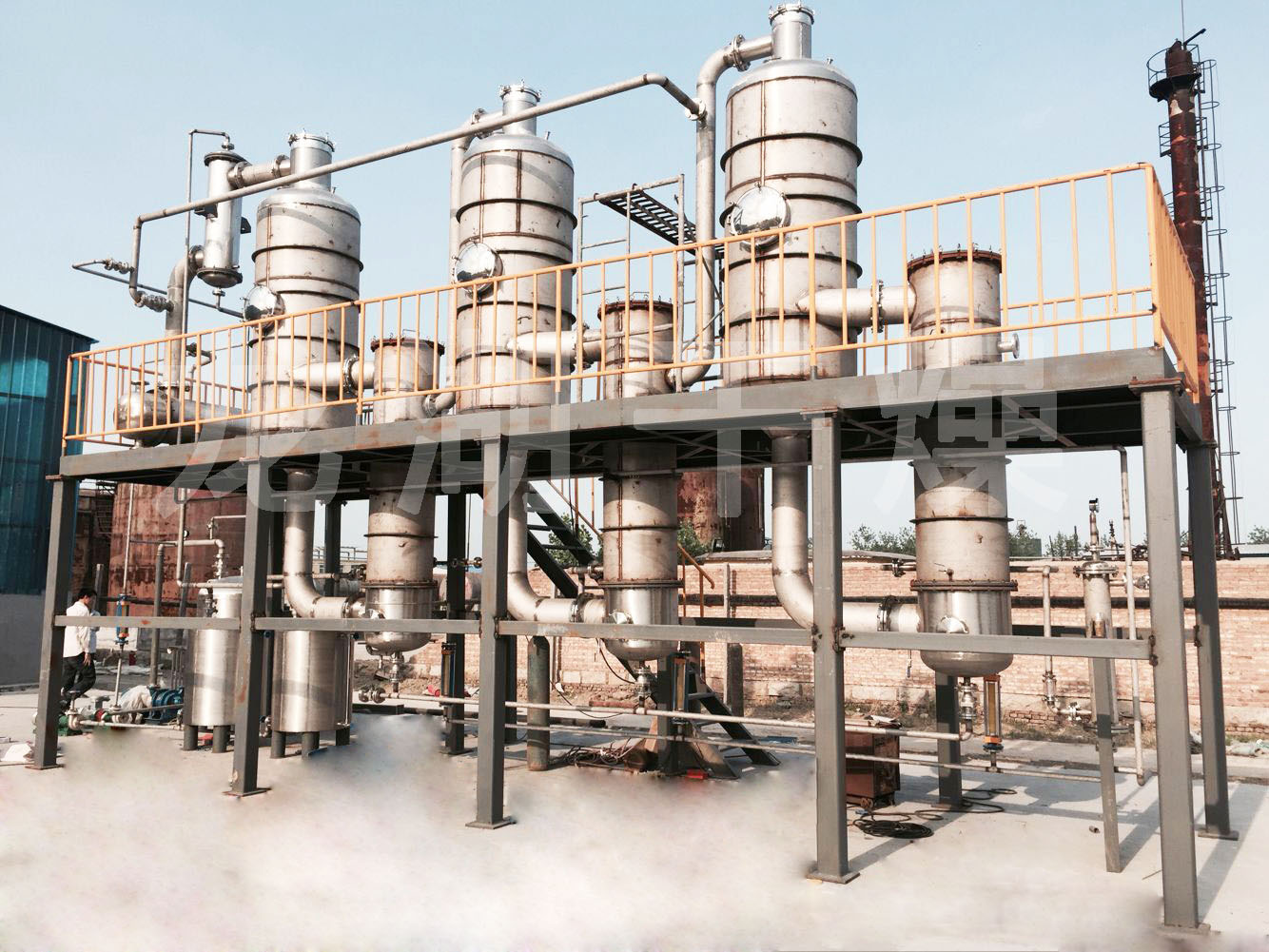 張家港某公司金屬清洗廢水使用現場,蒸發(fā)量每小時200kg,雙效蒸發(fā)器,配備電加熱蒸汽發(fā)生器